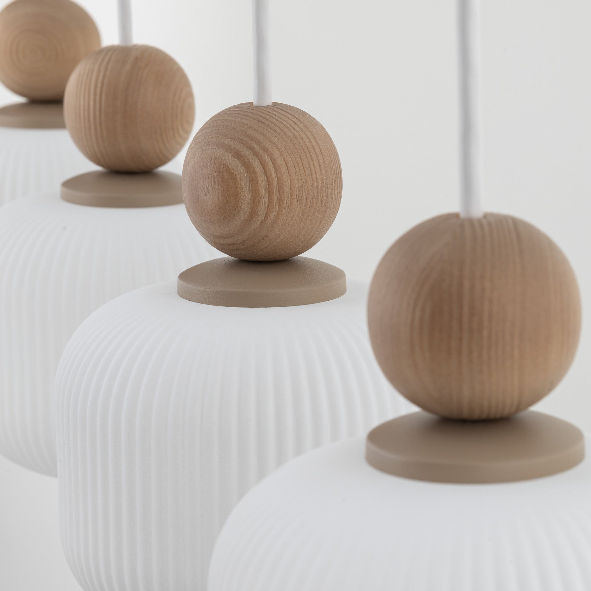 The Ballo Collection celebrates the balance between nature and form. Crafted from hand-blown glass and solid wood, each pendant brings a sense of warmth and refinement to any space. Its soft, rounded silhouette and ribbed texture echo mid-century European design, while the natural materials add a Scandinavian touch.